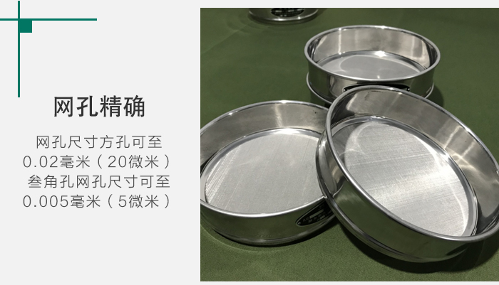2、網孔,因按網孔標記所以不同時間生產的同一規格網孔一致。金屬絲編織試驗篩,網孔尺寸方孔可至0.02毫米(20微米)叁角孔網孔尺寸可至0.005毫米(5微米),篩網按B6003.1-1997標準編織。