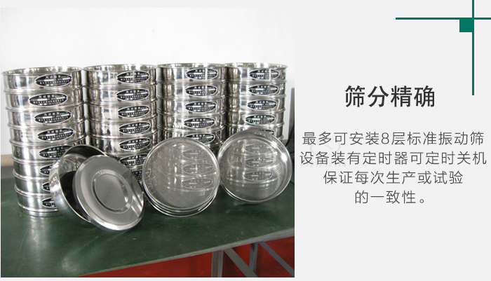 4、沖孔板試驗篩,按GB6003.2-1997標準加工。符合國際標準ISO3310-2:1990 R20/3,R20,R40/3系列。同時我公司也生產與φ200標準試驗篩配套的拍擊式試驗篩機、標準篩機。拍擊式試驗篩機、標準篩機符合標準,多可安裝8層標準振動篩,設備裝有定時器可定時關機,保證每次生產或試驗的一致性。